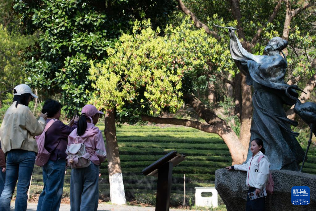 4月2日,在敬亭山国家森林公园一处茶园旁,游客在刻有李白诗句的石碑前留影。