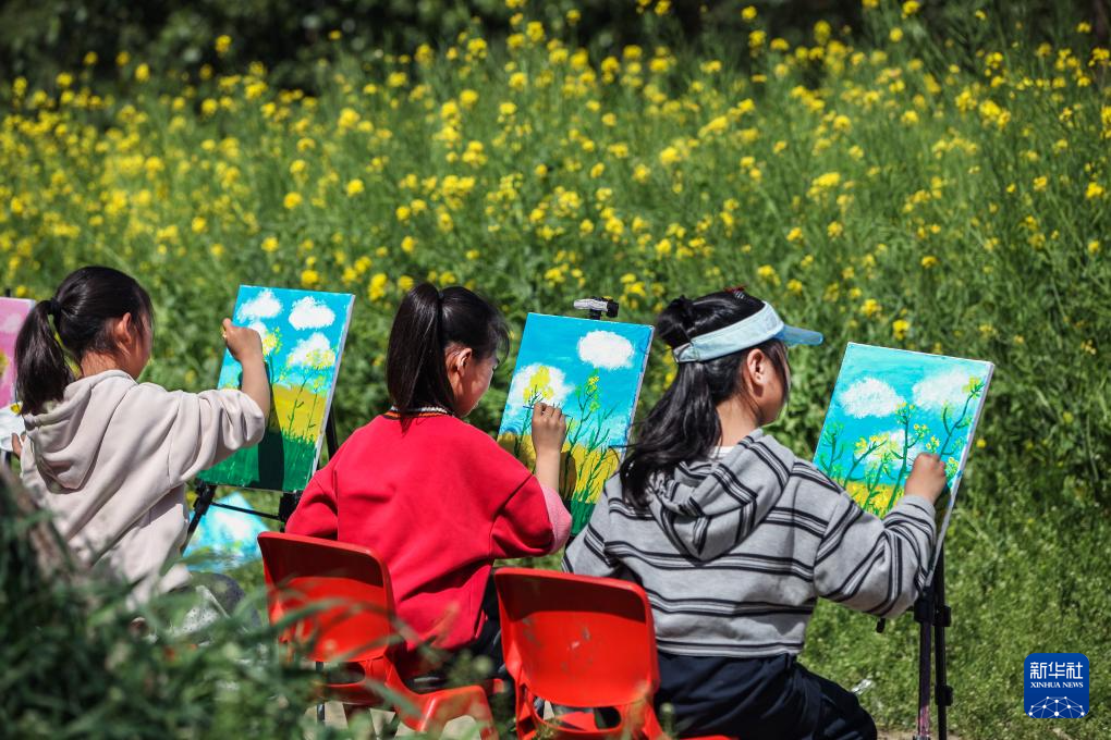 4月4日,在河南省焦作市博爱县人民公园,小朋友在写生。