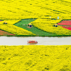 4月4日,游客在江苏省高邮市湖上花海景区乘船游玩(无人机照片)。