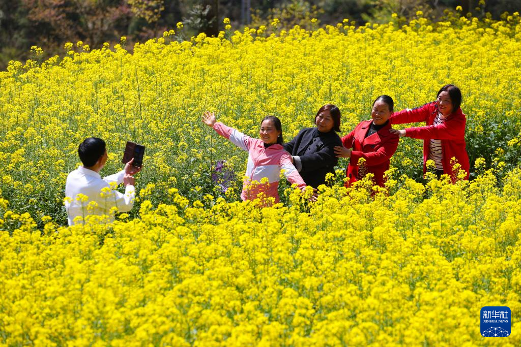 4月4日,游客在重庆市黔江区阿蓬江镇柒坨村五岭山露营基地油菜花田游玩。