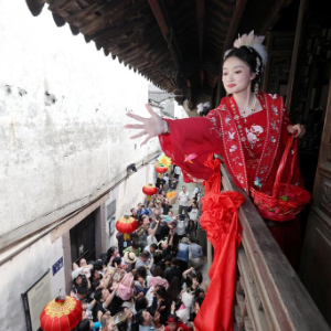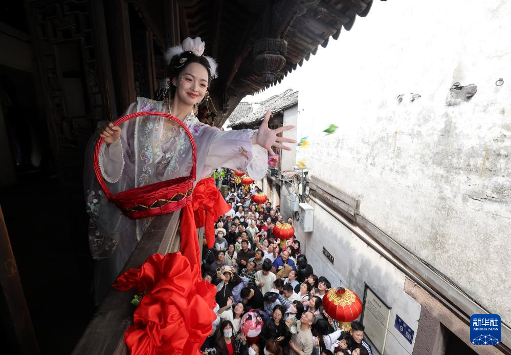 4月4日,在浙江省湖州市德清县新市古镇,“蚕花姑娘”向蚕农撒蚕花。