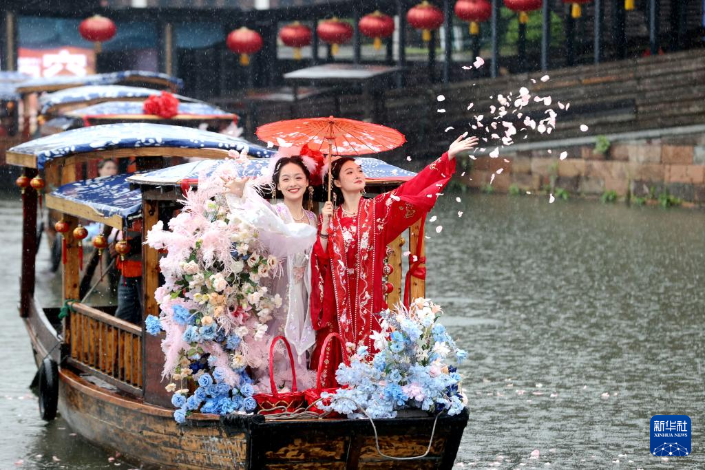 4月3日,在浙江省湖州市德清县新市古镇,“蚕花姑娘”在船上撒蚕花。