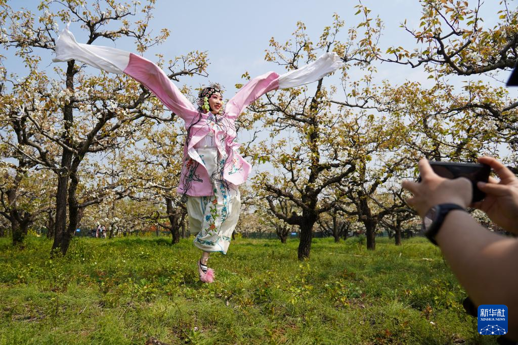 4月3日,戏曲爱好者在梨园内拍照留影。