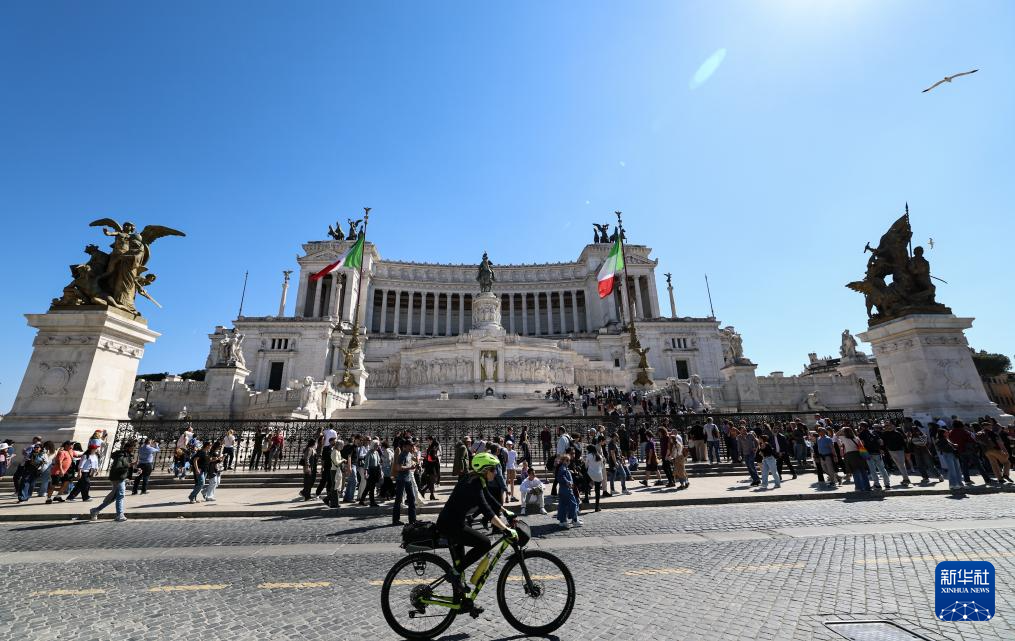4月4日,游客在意大利首都罗马的威尼斯广场参观游览。