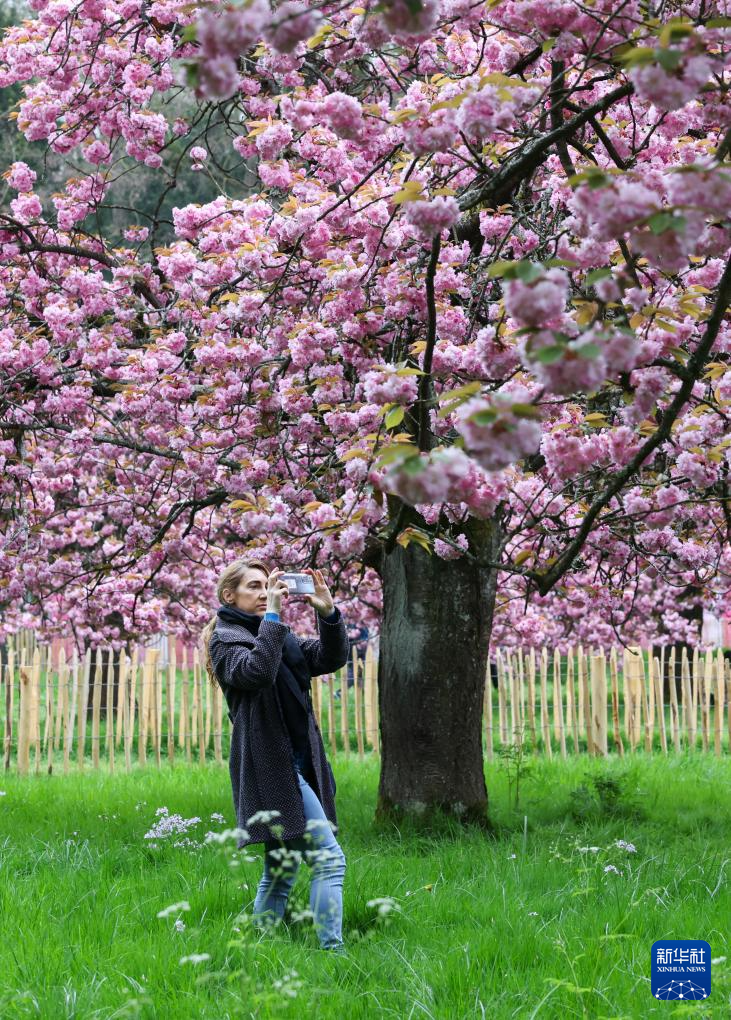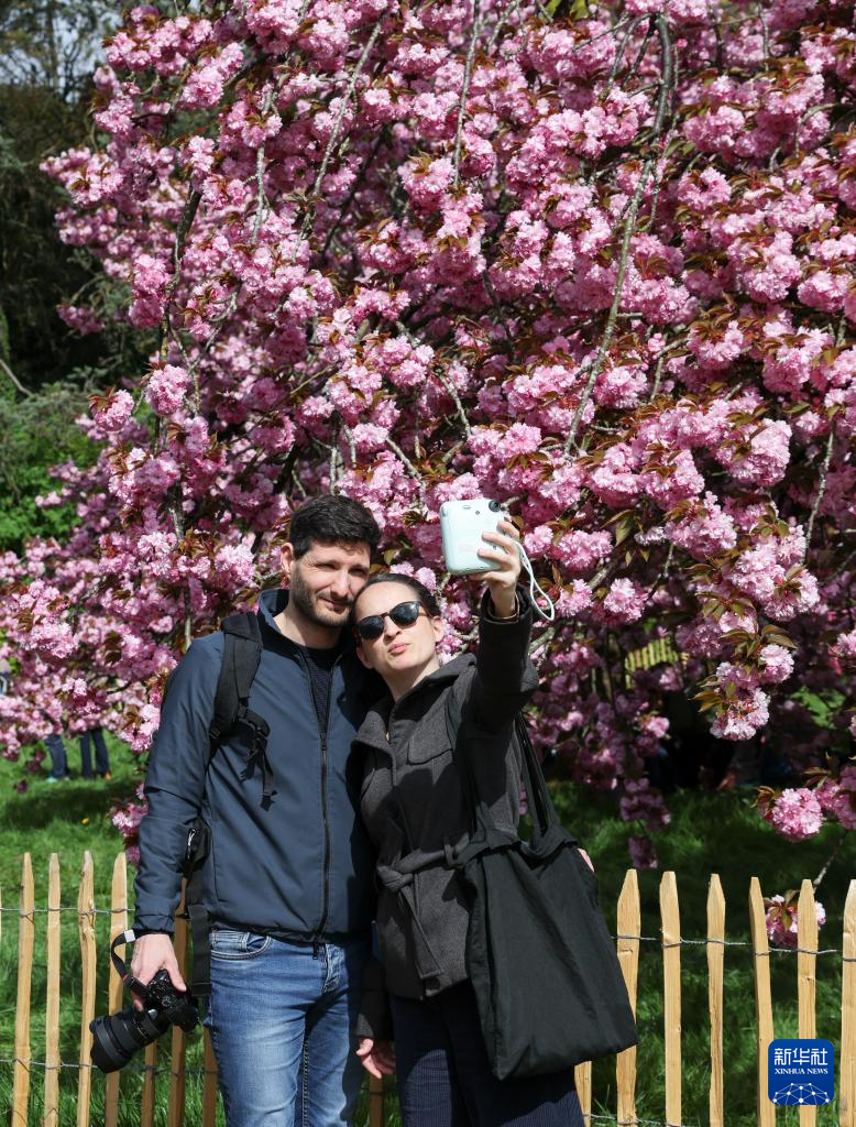 4月5日,人们在法国巴黎近郊索镇的国玺公园赏花拍照。