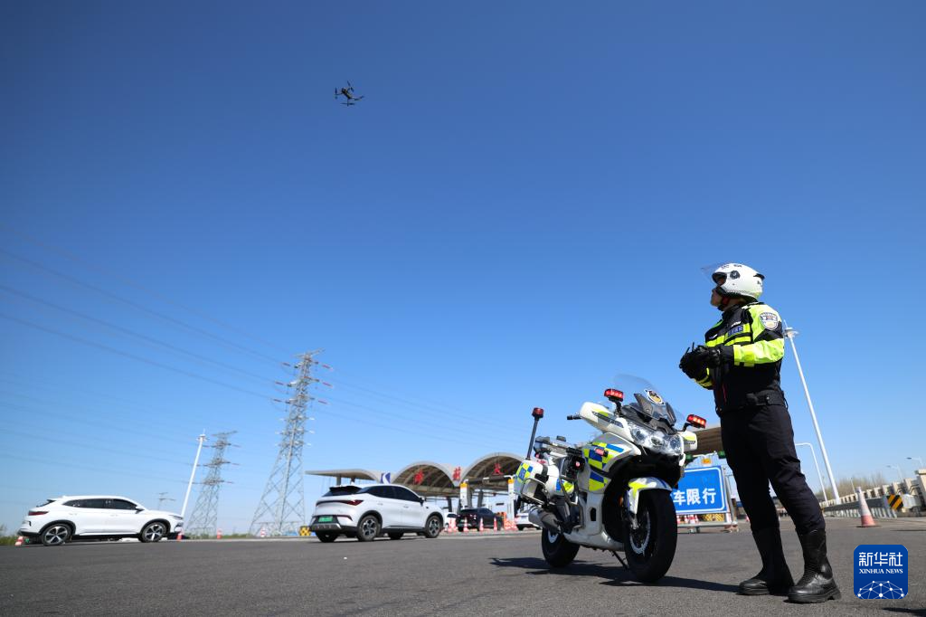 4月6日,天津市公安局交通管理总队高速公路支队交警在津蓟高速收费站出入口手动执飞无人机开展路面重点巡查。
