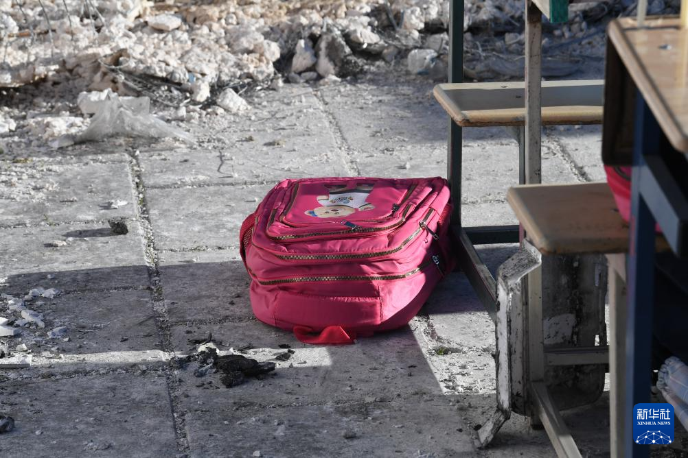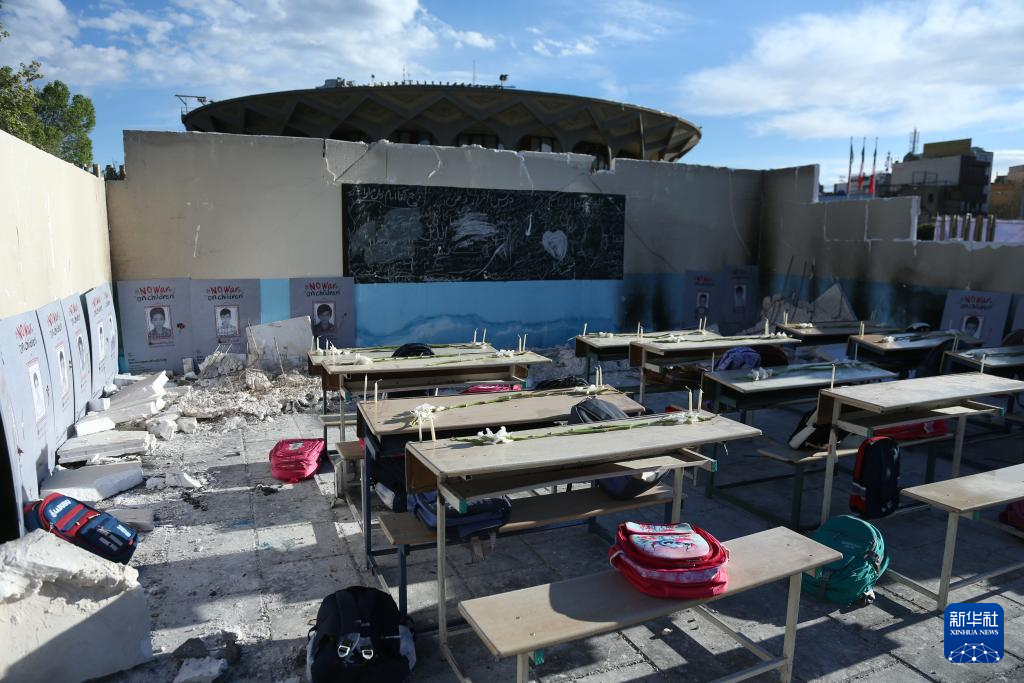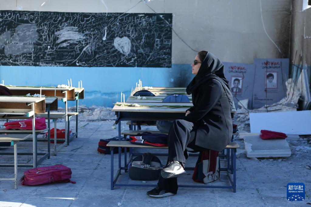 4月6日,在伊朗首都德黑兰市举行的悼念活动现场,组织者搭建起小学教室遭袭场景并摆放学生书包,悼念遭美以空袭遇难的米纳卜小学学生。