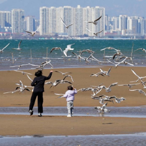 4月7日,游客在河北省秦皇岛市北戴河区沿海地区观看海鸥飞舞。