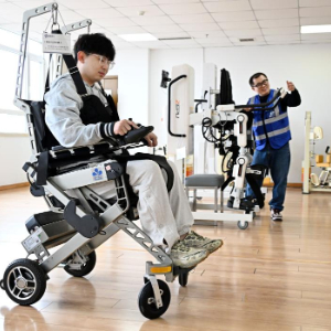4月9日,在青岛市康养领域具身机器人暨智能康复类产品训练验证中心,工作人员准备对一台成人专用外骨骼机器人进行测试。