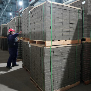 4月9日,工人在河北省迁安市一家以钢渣等固废为原料生产“钢砖”的企业成品车间核对产品批号。