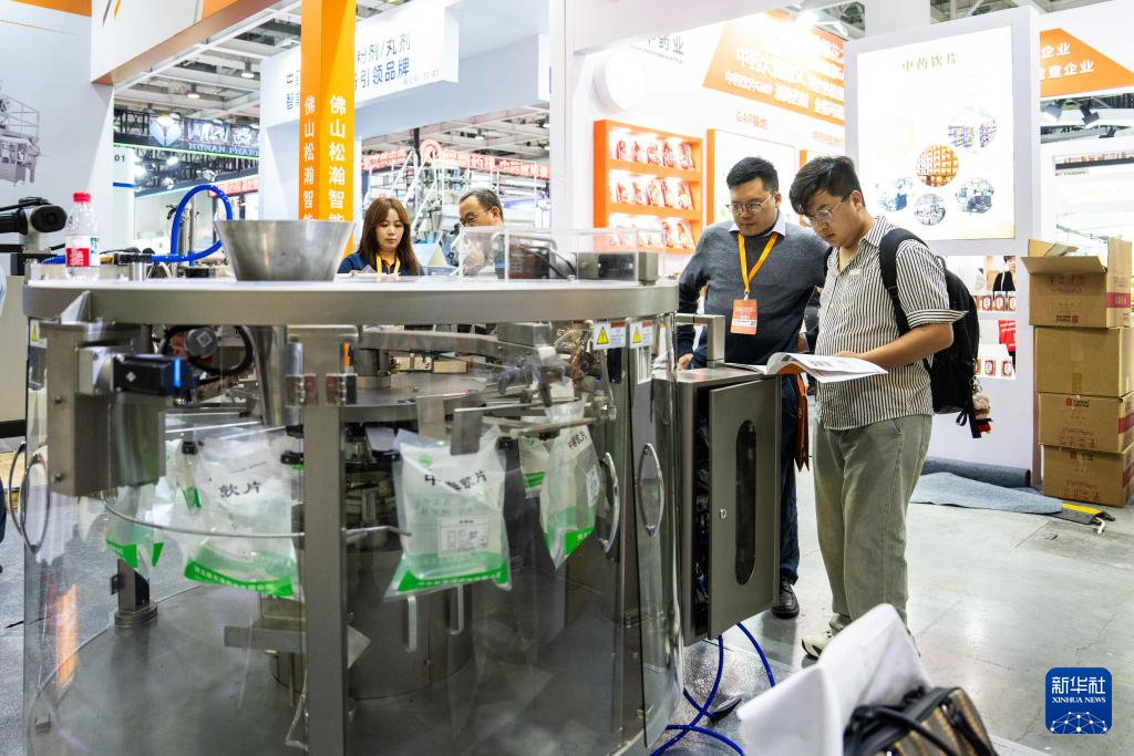 4月10日,在湖南国际会展中心,观众(右一)在了解一款自动化药品包装设备。