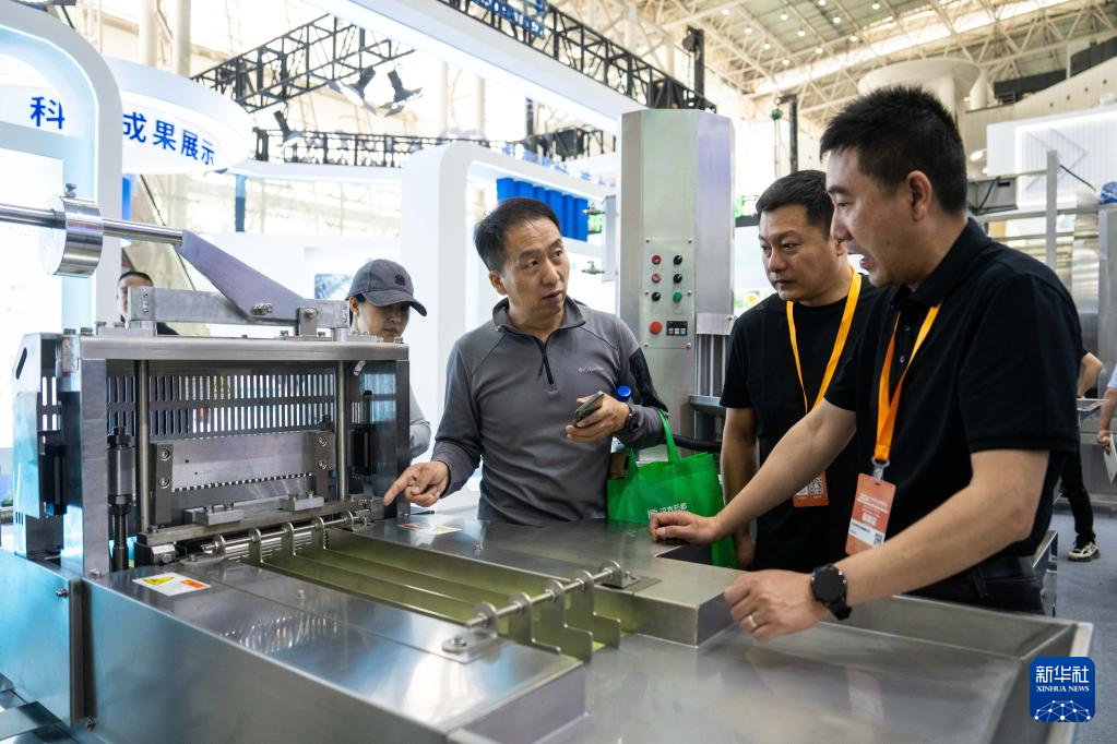 4月10日,在湖南国际会展中心,观众(右三)在了解一款中药材自动切片机。