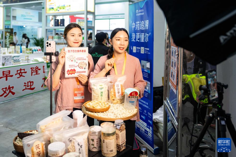 4月10日,在湖南国际会展中心,参展商通过直播推销食疗养生产品。