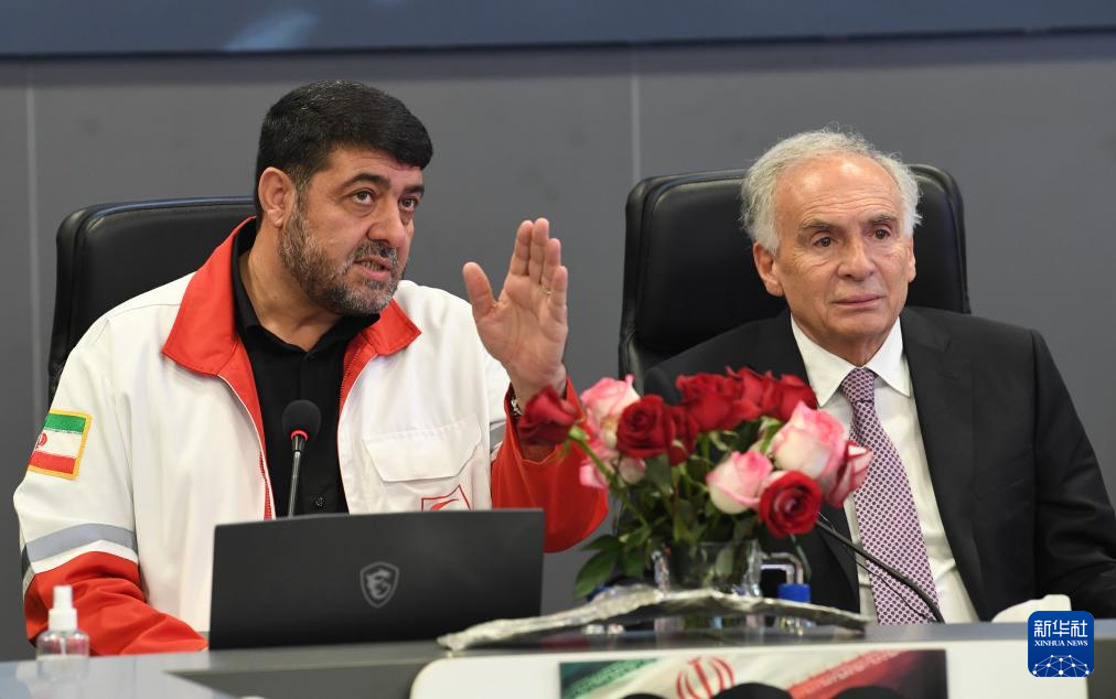 4月9日,在伊朗首都德黑兰,伊朗红新月会主席皮尔侯赛因·科利万德(左)向联合国秘书长个人特使让·阿尔诺介绍相关情况。