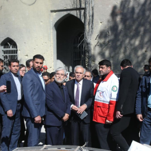 4月9日,在伊朗首都德黑兰,联合国秘书长个人特使让·阿尔诺(中)实地察看遭美以空袭的伊朗大学损毁现场。