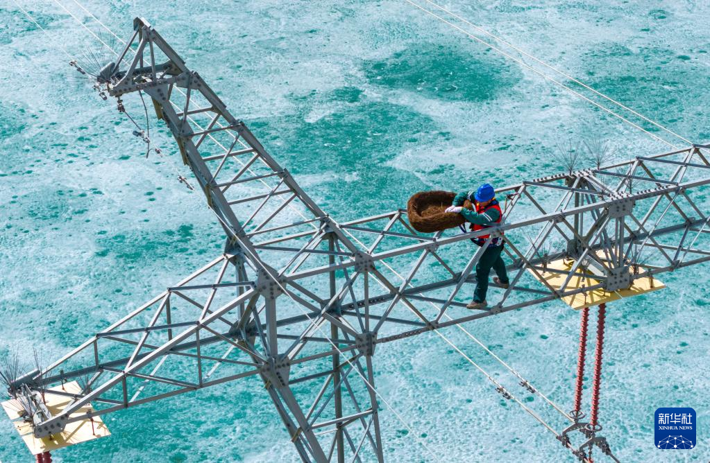 在位于新疆阿勒泰福海县的乌伦古湖国家湿地公园,国网阿勒泰供电公司工作人员在固定生态鸟巢(4月1日摄,无人机照片)。
