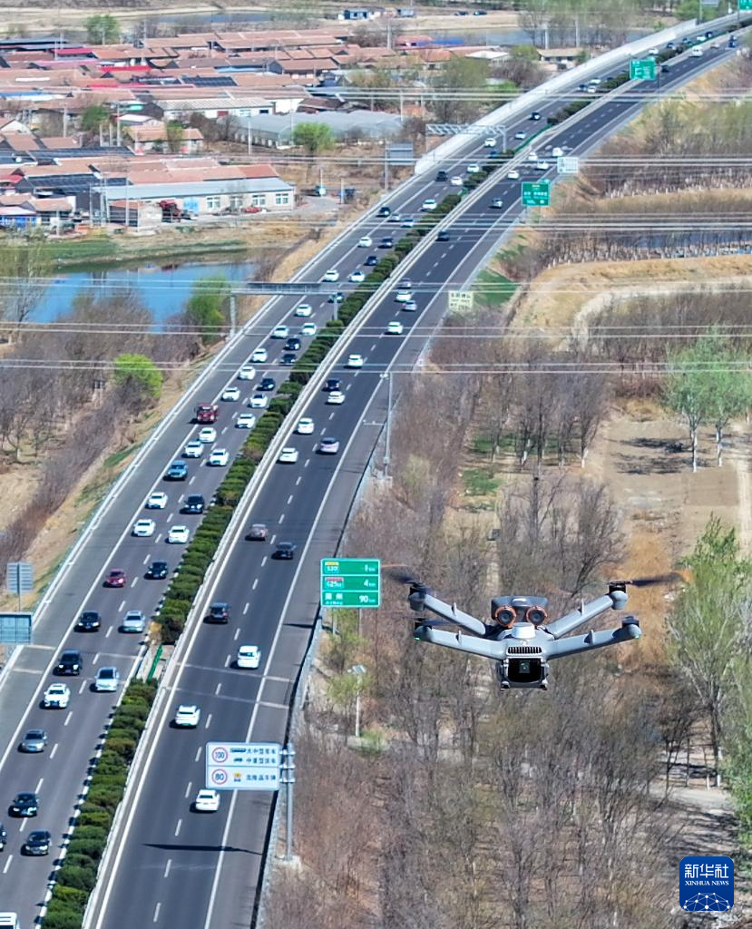 4月6日,清明假期最后一天,天津市公安局交通管理总队高速公路支队采用无人机在津蓟高速上空进行视频定时巡查,保障假期返程高峰有序畅通(无人机照片)。