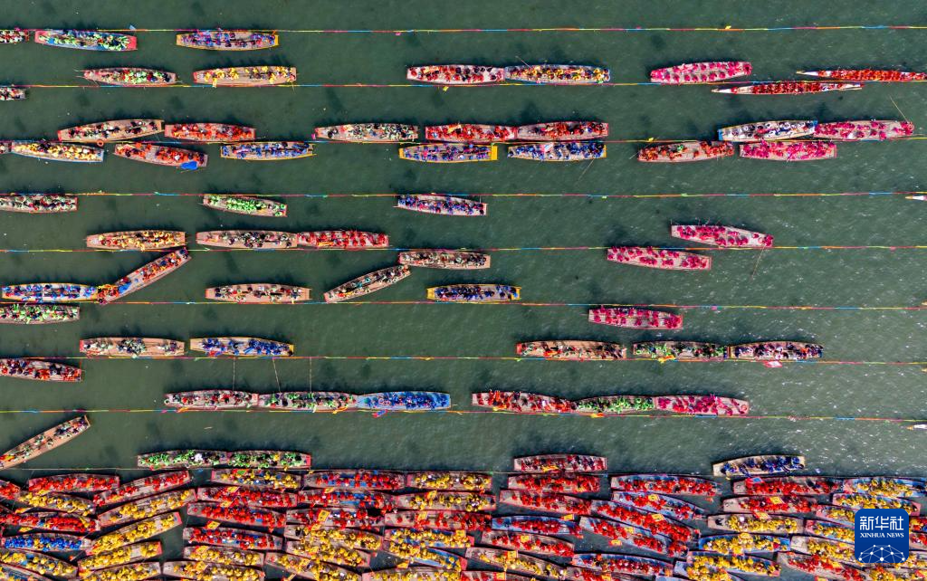 4月6日,2026年泰州姜堰溱潼会船节在江苏省泰州市姜堰区溱湖国家湿地公园开幕。这是参加会船表演的船只整装待发(无人机照片)。