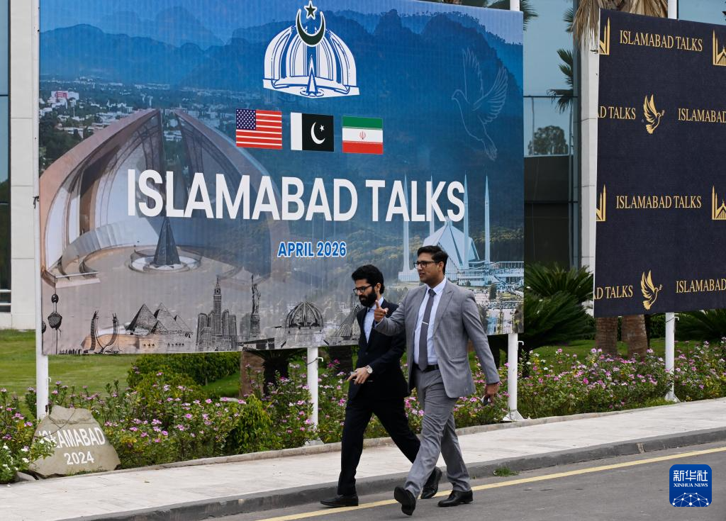 4月11日,人们走过巴基斯坦伊斯兰堡的美伊谈判新闻中心。