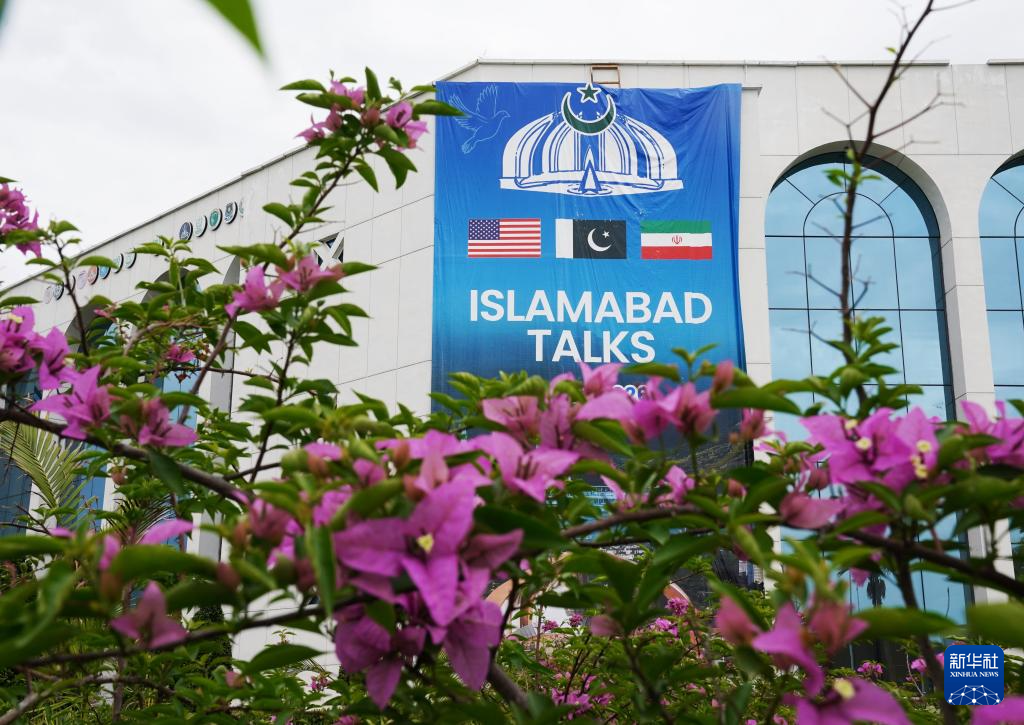 这是4月11日在巴基斯坦伊斯兰堡拍摄的美伊谈判新闻中心外景。