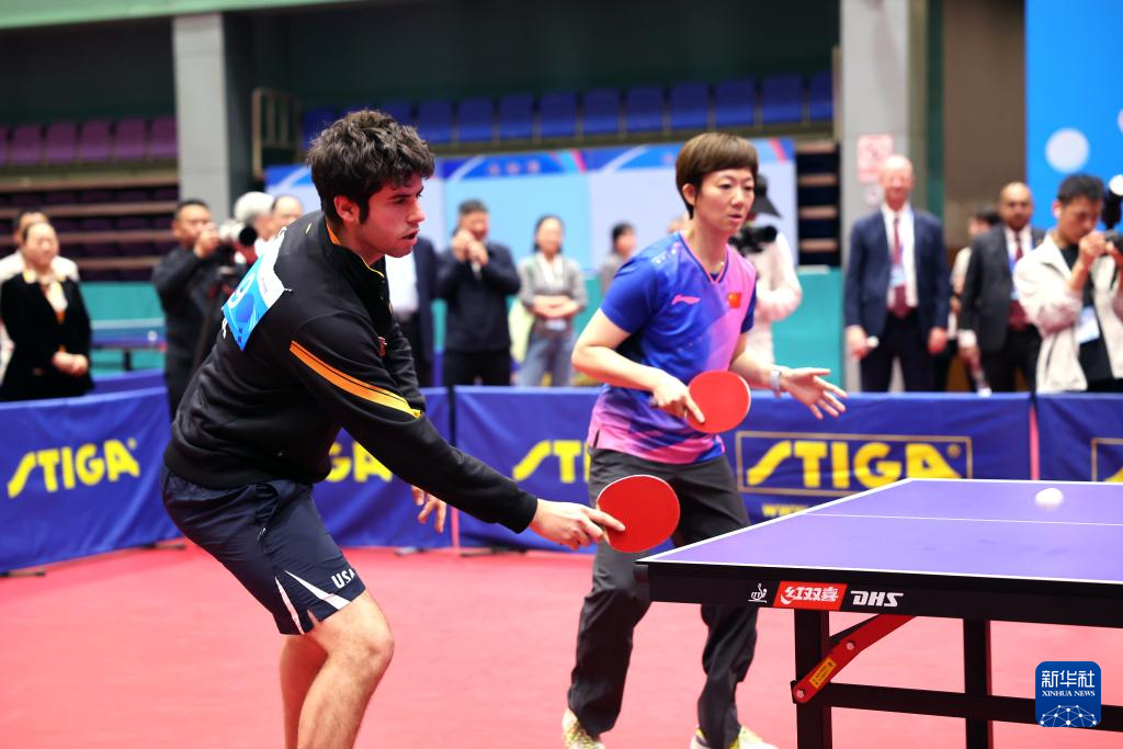 4月11日,美国青年乒乓球运动员在石家庄外国语学校与学生进行乒乓球友谊赛。