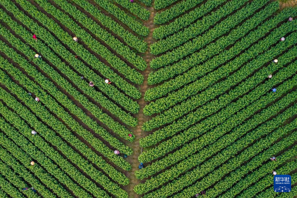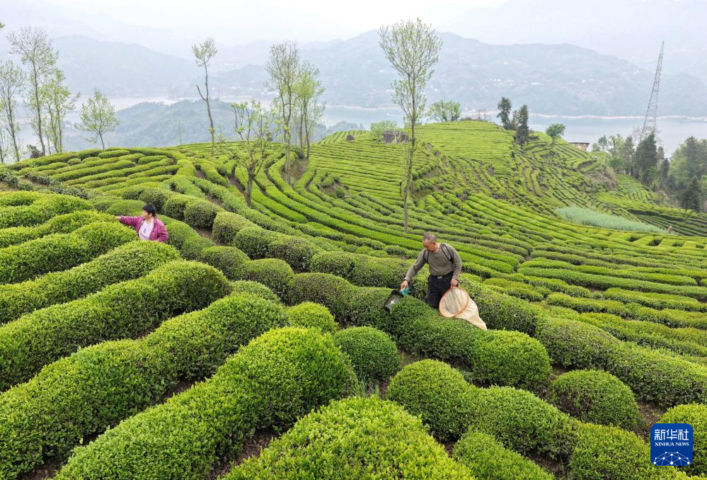 4月11日,茶农在湖北省秭归县茅坪镇松树坳村一生态茶园采摘春茶(无人机照片)。