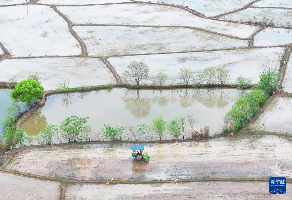 4月11日,在湖南省衡阳市祁东县金桥镇,农民驾驶插秧机进行早稻插秧工作(无人机照片)。