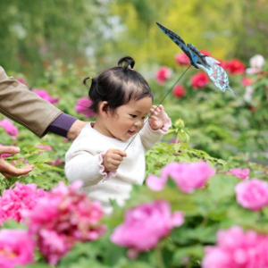 4月11日,小朋友在江苏省淮安市洪泽区西顺河牡丹园内游玩。