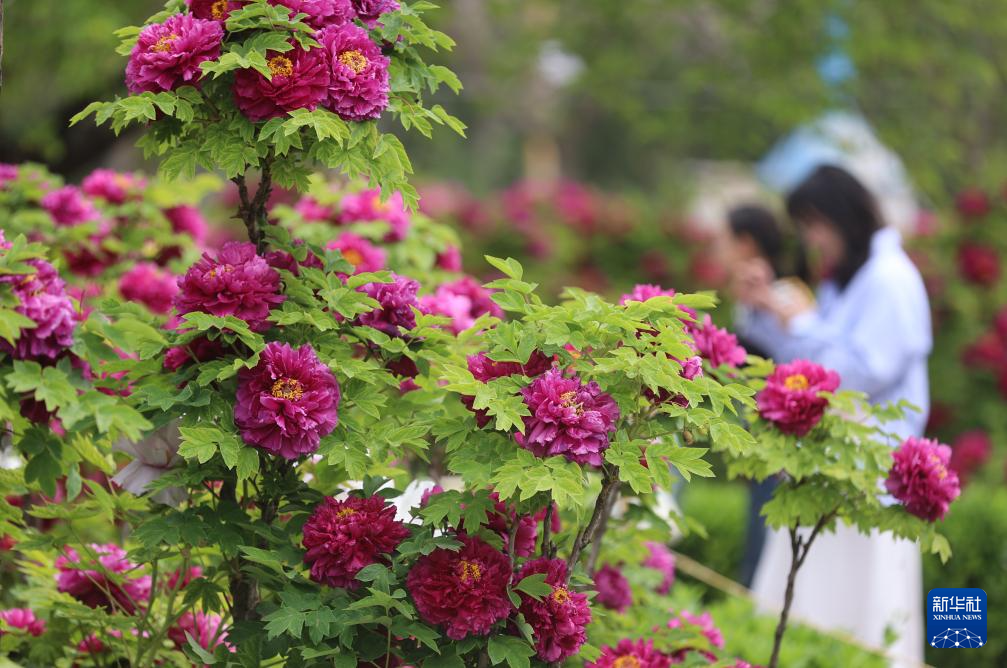 4月11日,游客在河南省三门峡市天鹅湖国家城市湿地公园牡丹苑观赏牡丹。