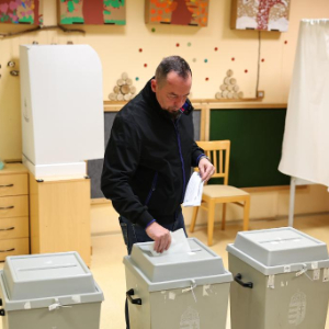 4月12日,在匈牙利首都布达佩斯,匈牙利蒂萨党领导人毛焦尔·彼得在一处投票站投票。