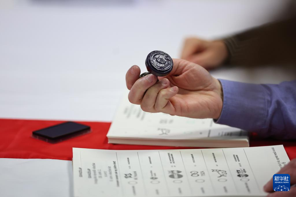 4月12日,在匈牙利布达佩斯,一名工作人员在一处投票站为选票盖章。