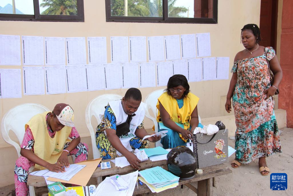 4月12日,在贝宁维达市一处投票站,工作人员核对选民信息。