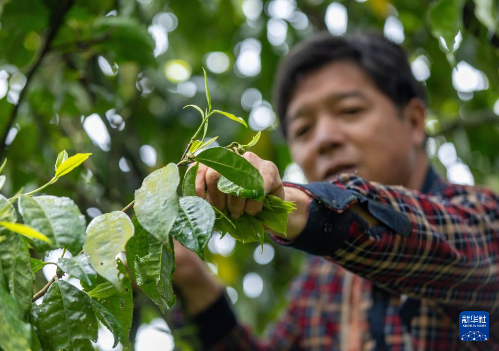 4月11日,重庆市南川区德隆镇茶树村,茶农在古茶树上细心挑选优质茶芽。