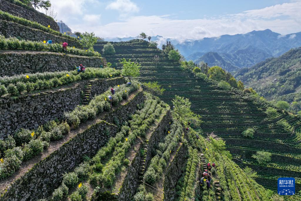 4月10日,茶农在浙江省湖州市德清县莫干山镇北湖村生态茶园采摘春茶(无人机照片)。