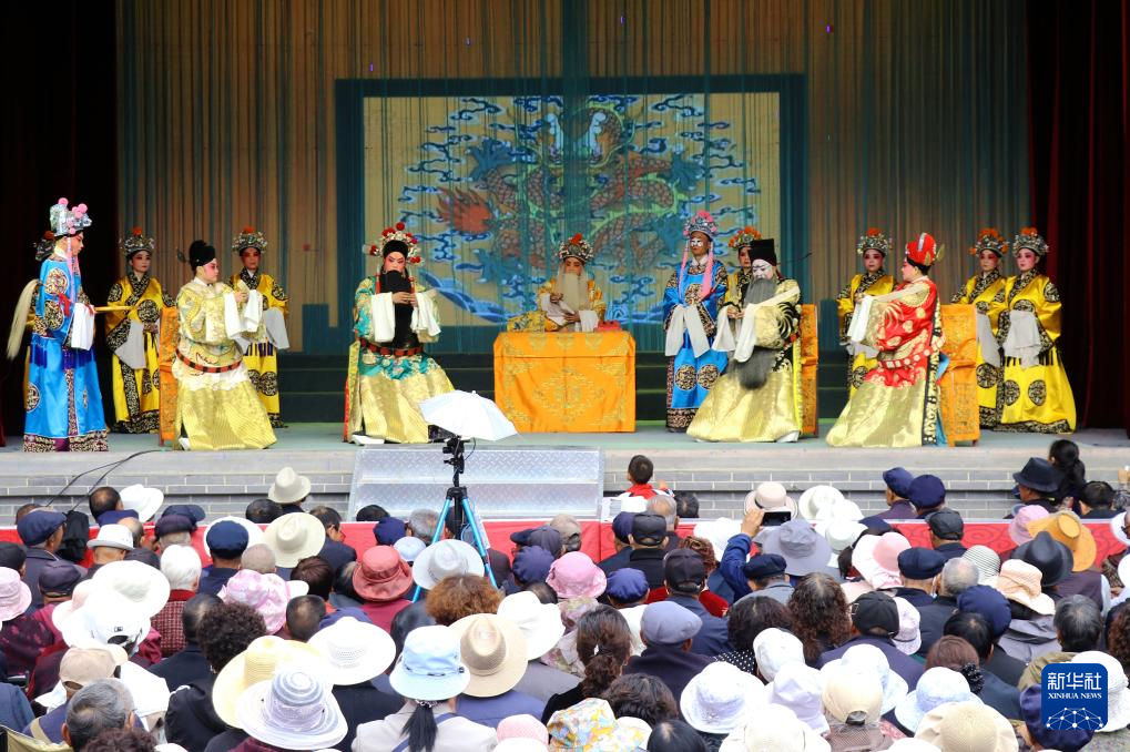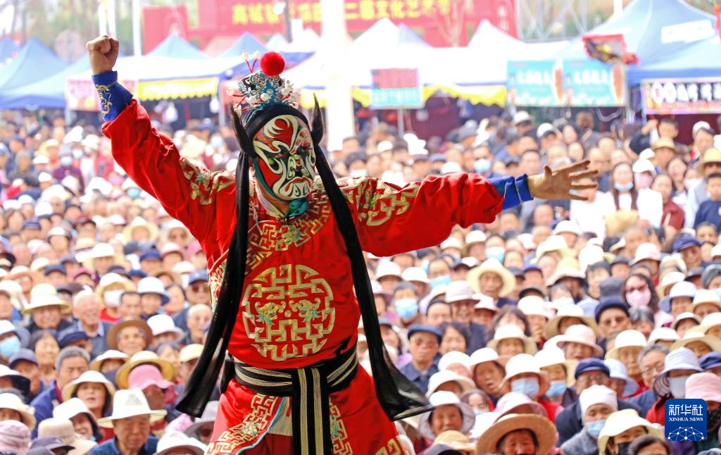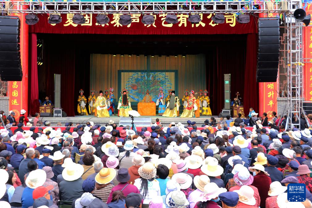 4月12日,在静宁县八里镇高城寨村,群众在观看秦腔演出。
