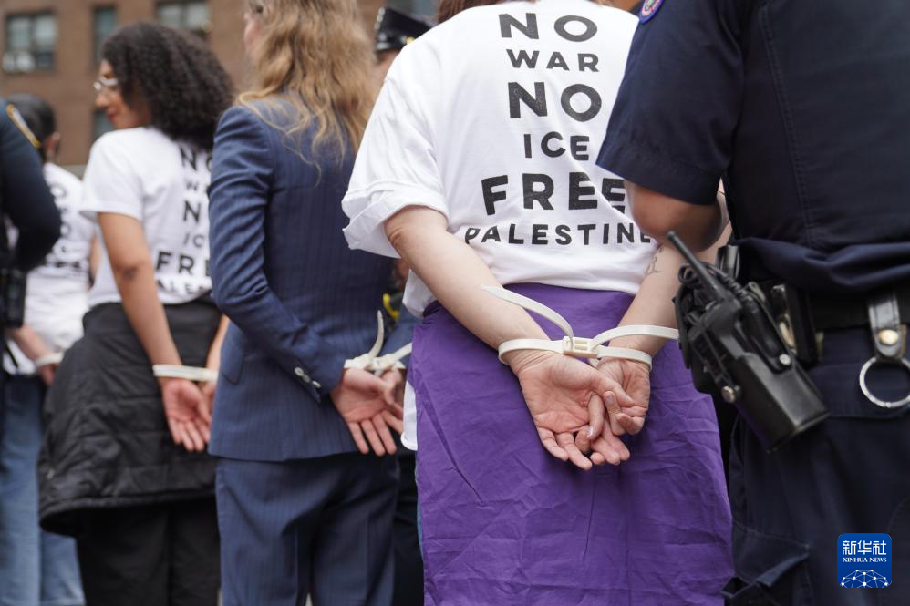 4月13日,民众在美国纽约曼哈顿举行反对战争、声援巴勒斯坦,以及反对美国移民与海关执法局驱逐移民的抗议活动。