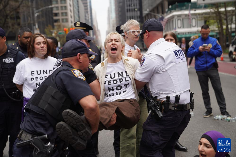 4月13日,在美国纽约曼哈顿,一名参加抗议活动的女子被警察带离现场。