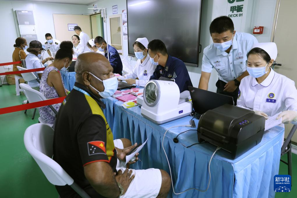 4月11日,执行“和谐使命-2025”任务的中国海军“丝路方舟”号医院船在巴布亚新几内亚开展医疗服务。这是医院船挂号处。
