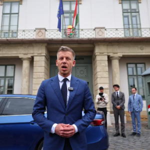 4月15日,在位于匈牙利布达佩斯的总统府前,蒂萨党主席毛焦尔·彼得回答记者提问。