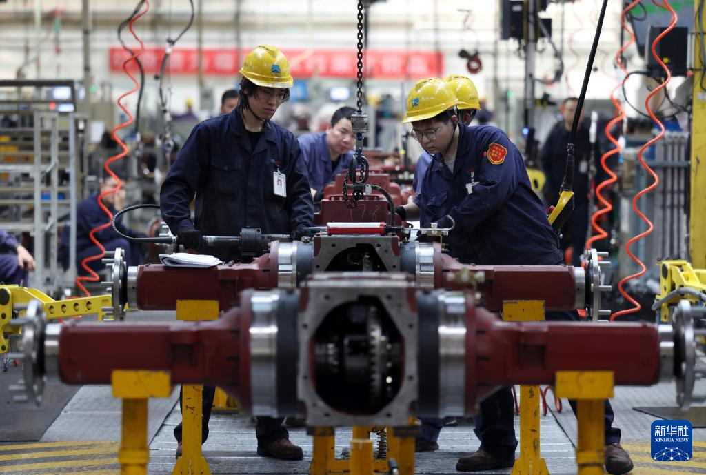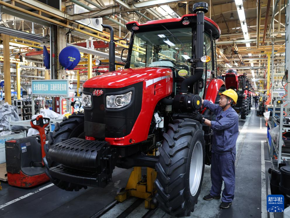 工人在位于河南洛阳的国机集团中国一拖大轮拖总装线作业(2026年4月14日摄)。