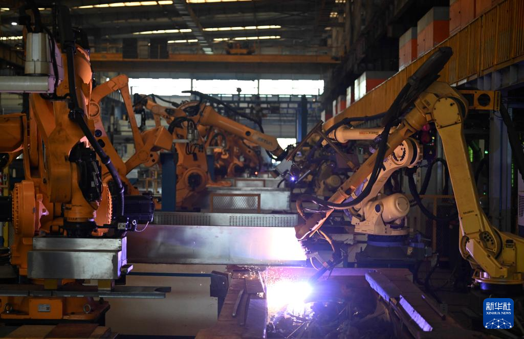 自动切割机器人在中创智领集团灯塔工厂智能坡口生产线上作业(2026年3月30日摄)。