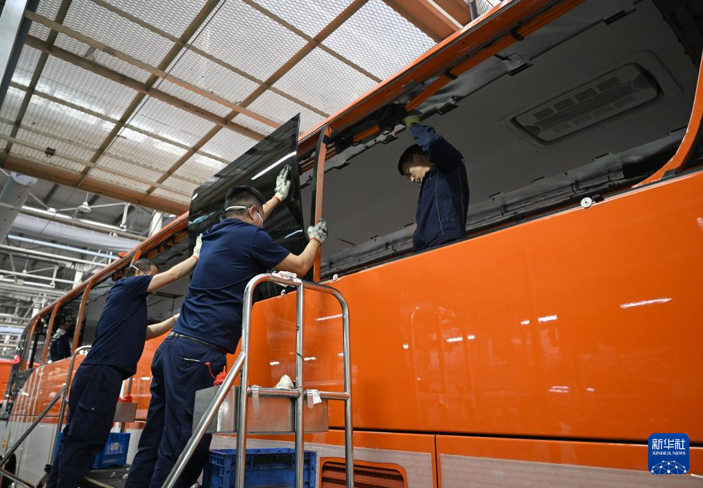 工作人员在宇通新能源厂区海外承装车间生产线上作业(2026年3月30日摄)。