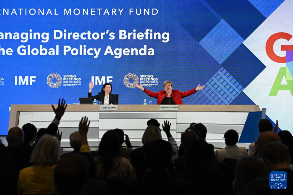 4月15日,在美国首都华盛顿,国际货币基金组织(IMF)总裁格奥尔基耶娃(上右)在IMF和世界银行春季会议期间的新闻发布会上等待记者提问。