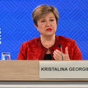 4月15日,在美国首都华盛顿,国际货币基金组织(IMF)总裁格奥尔基耶娃在IMF和世界银行春季会议期间的新闻发布会上讲话。