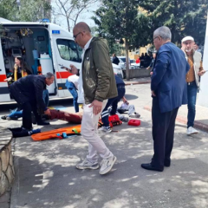 4月15日,在土耳其卡赫拉曼马拉什省一所中学的枪击事件现场,急救人员在抢救受伤人员。