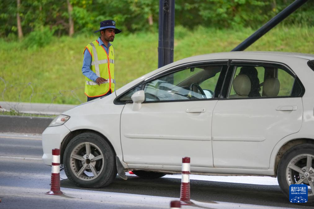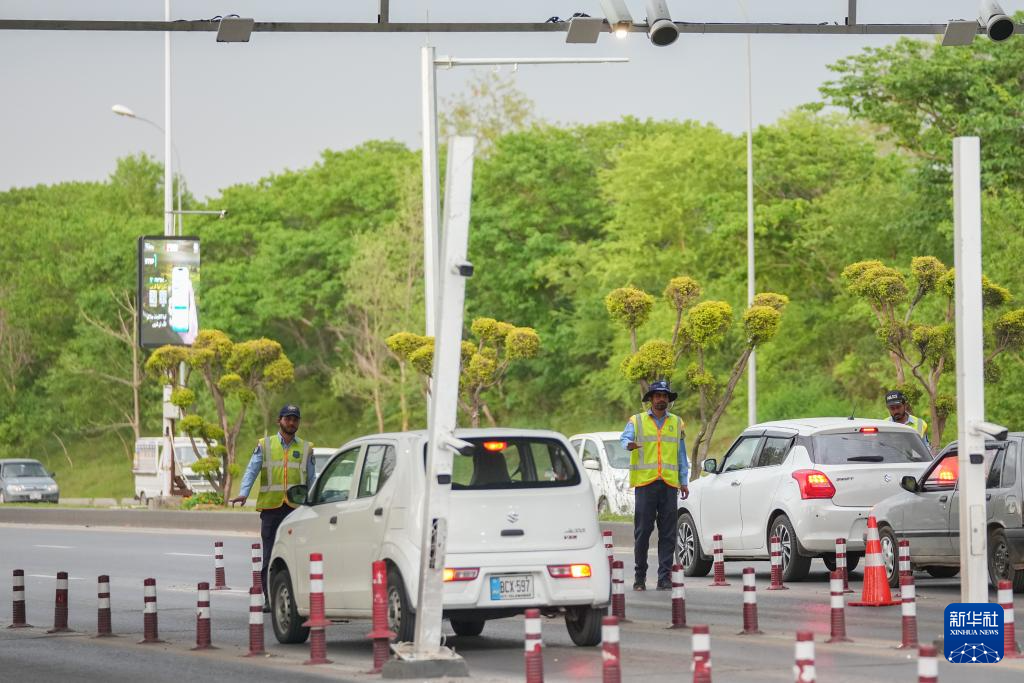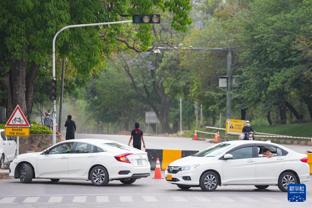 4月16日,在巴基斯坦首都伊斯兰堡,汽车从安全核心区附近设置的路障前绕行。