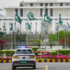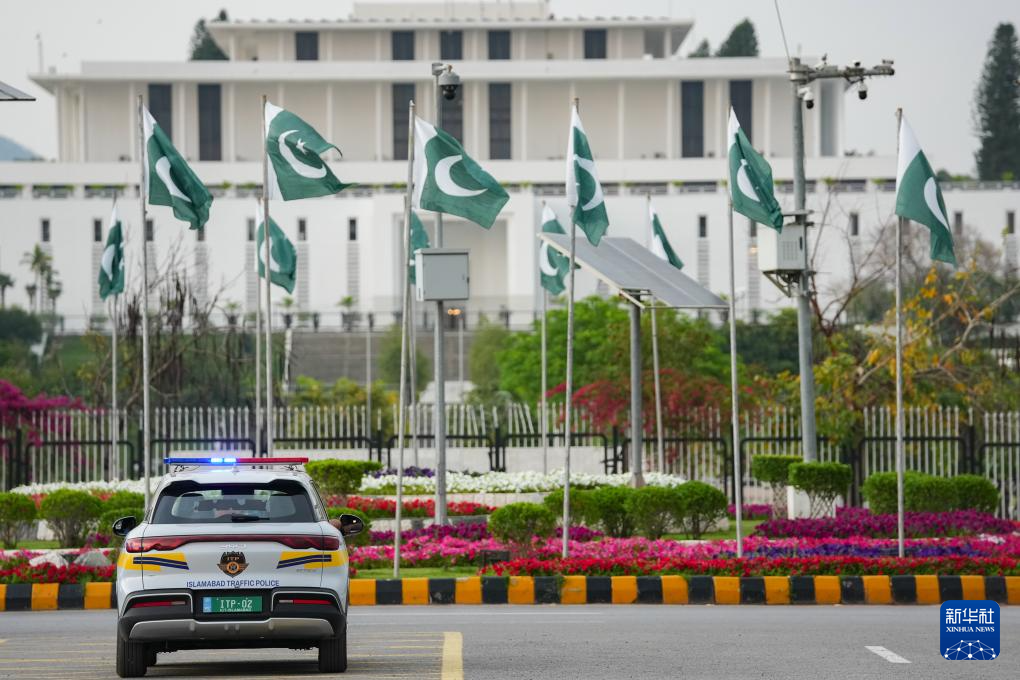 这是4月16日在巴基斯坦首都伊斯兰堡总统府前拍摄的警车。