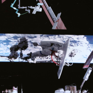 这是4月16日在北京航天飞行控制中心屏幕上拍摄的神舟二十一号乘组航天员武飞在舱外工作的画面。