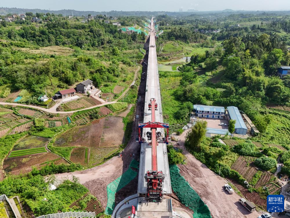 这是4月17日在四川省广安市境内拍摄的西渝高铁双碉楼特大桥架梁作业现场(无人机照片)。