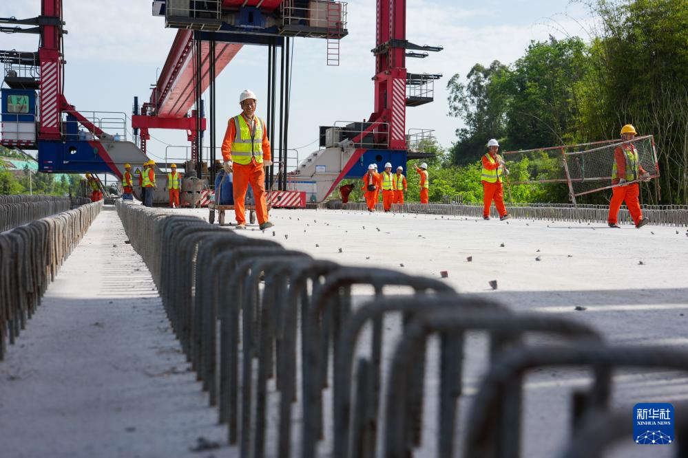 4月17日,工人在西渝高铁双碉楼特大桥进行架梁作业。